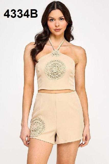SET BEIGE FLORES 3/D, BLUSA HALTER L