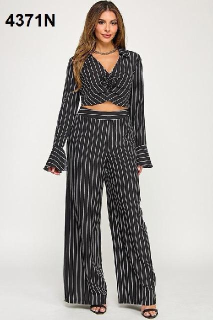 SET NEGRO RAYADO, BLUSA ACAMPANADA CON FLOR L